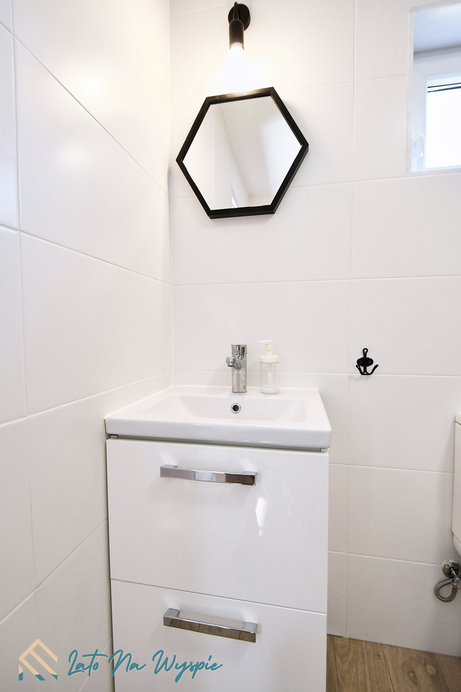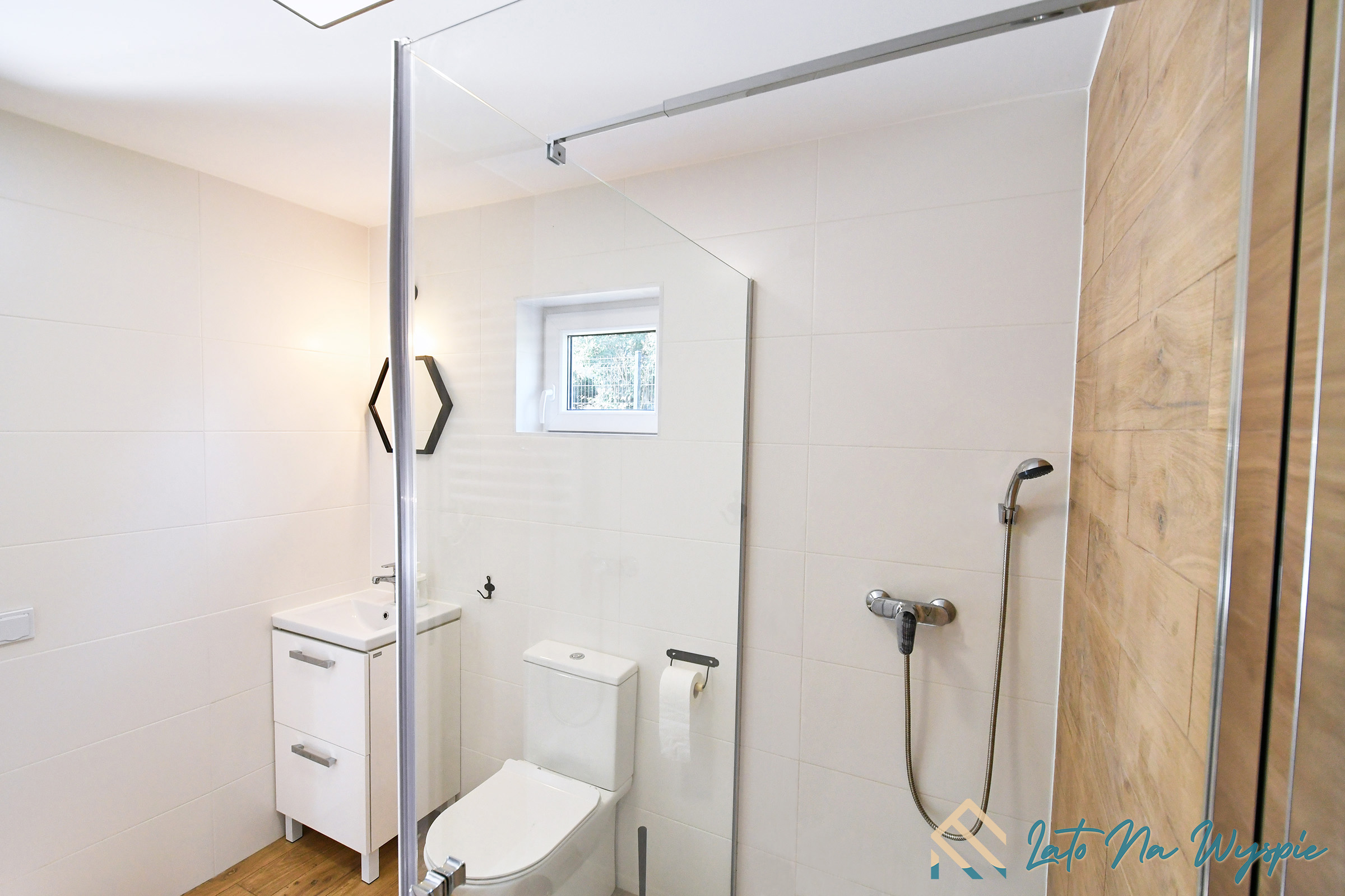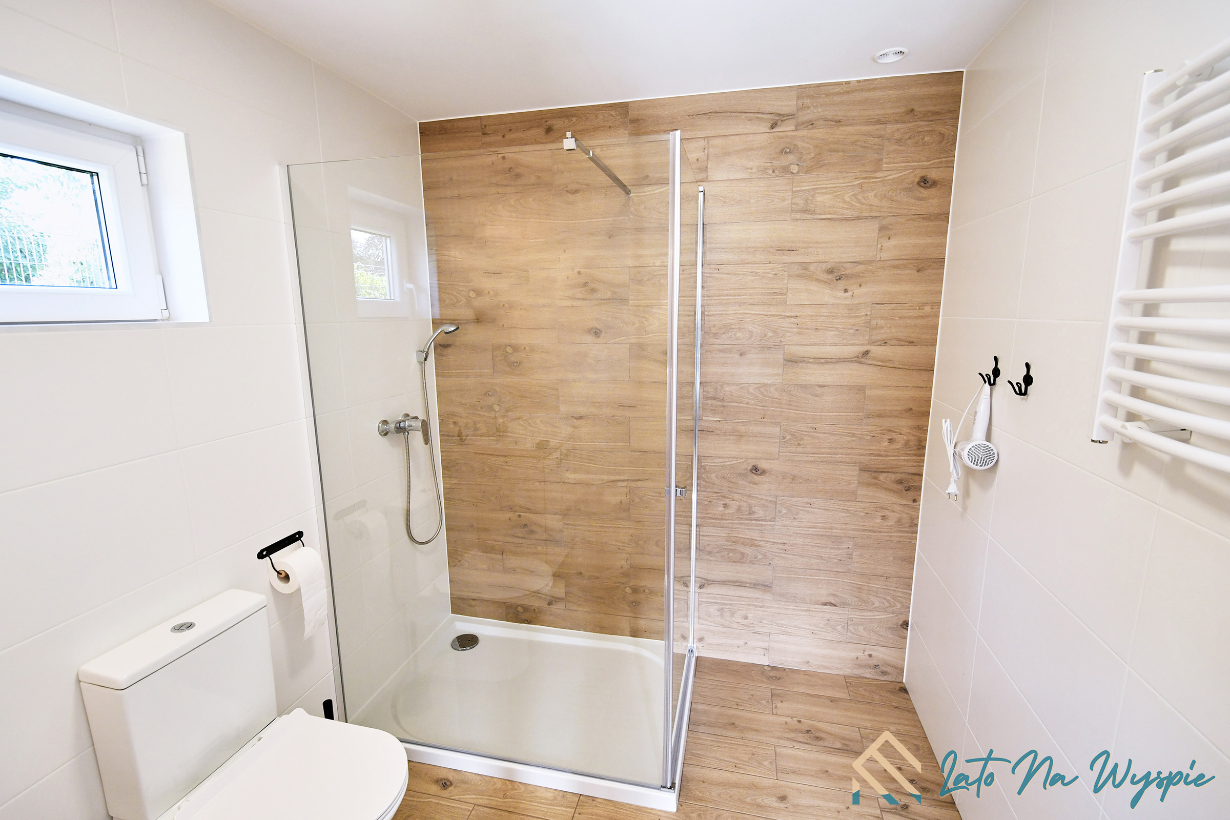 kabina prysznicowa, WC, umywalka, grzejnik na ręczniki, suszarka do włosów